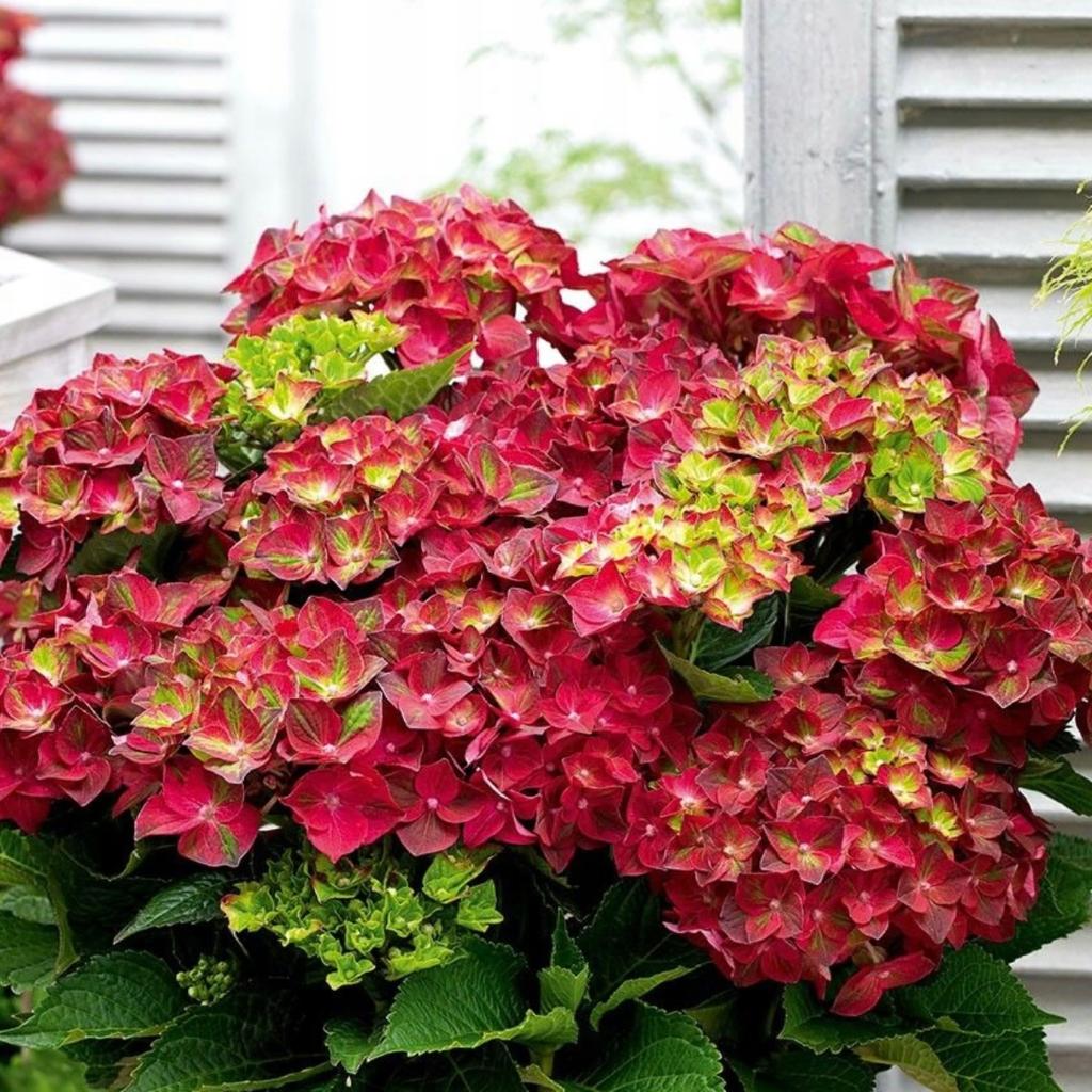 ГОРТЕНЗИЯ КРУПНОЛИСТНАЯ Royal Red — не высокий, пышный, лиственный кустарник шаровидной формы с красными цветами (в начале цветения имеют зеленую серединку), собранными в роскошные шапки до 15 см в диаметре, на фоне темно-зеленых листьев.